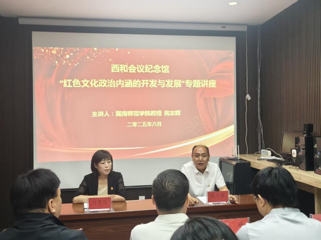 高志辉教授在红色文化研究方面成果颇丰,对红色文化的政治内涵有着深入的见解。他从多个维度深入剖析了红色文化的政治内涵,浅谈了红色文化传承存在的盲区和短板,阐述了红色精神的转化路径和方法;与西和会议纪念馆工作人员形成了良好的课堂互动模式,双方就“新时代如何更好弘扬红色文化”展开务实交流和积极探讨,形成兼具学术性与操作性的共识成果。通过高校学术资源与地方文化场馆的交流共建,将推动公司红色文化理论研究与新时代红色基因传承实践相结合,为地方红色文化挖掘阐释、传承利用贡献力量。