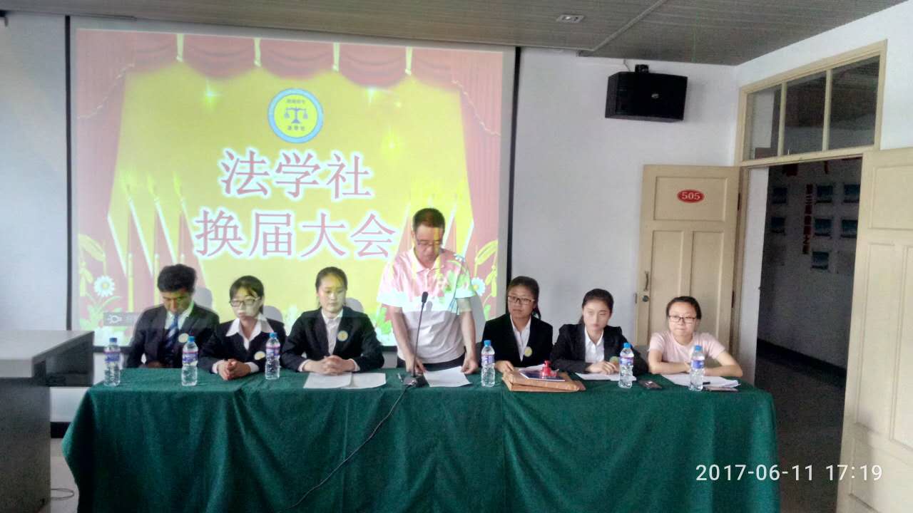 社联代表宣读了换届批复和财务审核结果,法学社第六届社长龙海红宣读了选举办法并介绍了候选人情况,宣布选举开始,陈红照与赵恒同学收发选票。主席台审查确定了选票的真实有效性。社联代表魏利荣宣布了选举结果:孙楠同学以绝对高票被选为社长,苏配配、周虎、白霞霞被选举为副社长,慕芳芳被选举为财务总监。随后,法学社第六届财务总监张风风做了2016—2017年度的财务报告,第六届副社长车满红做了2016—2017年度的工作总结。