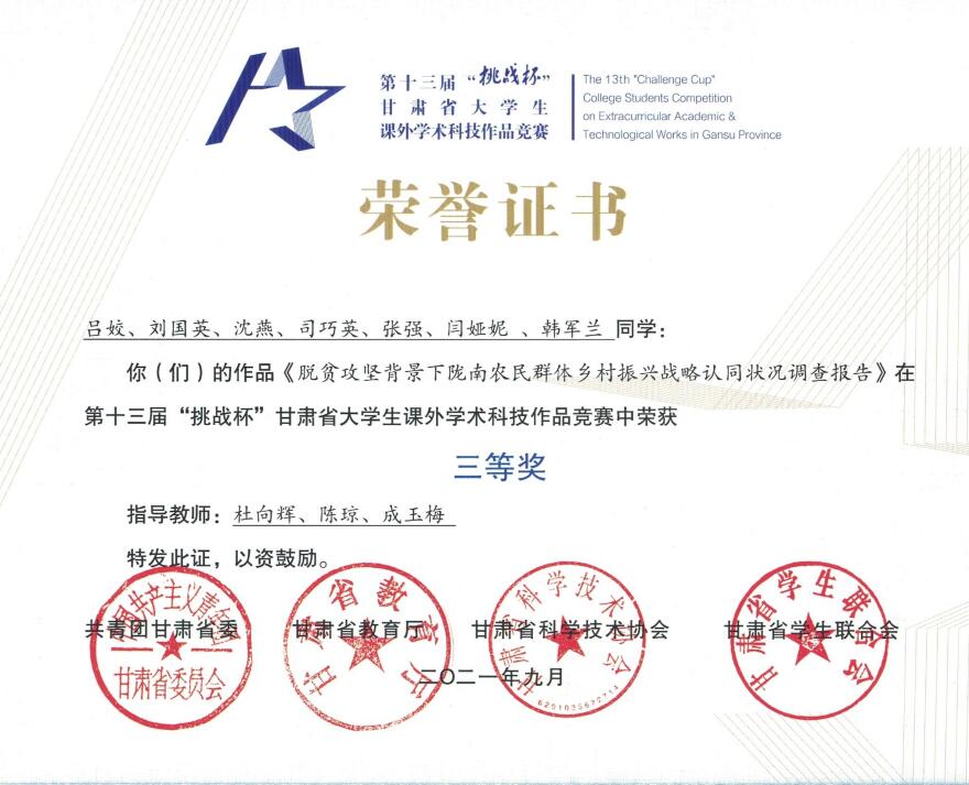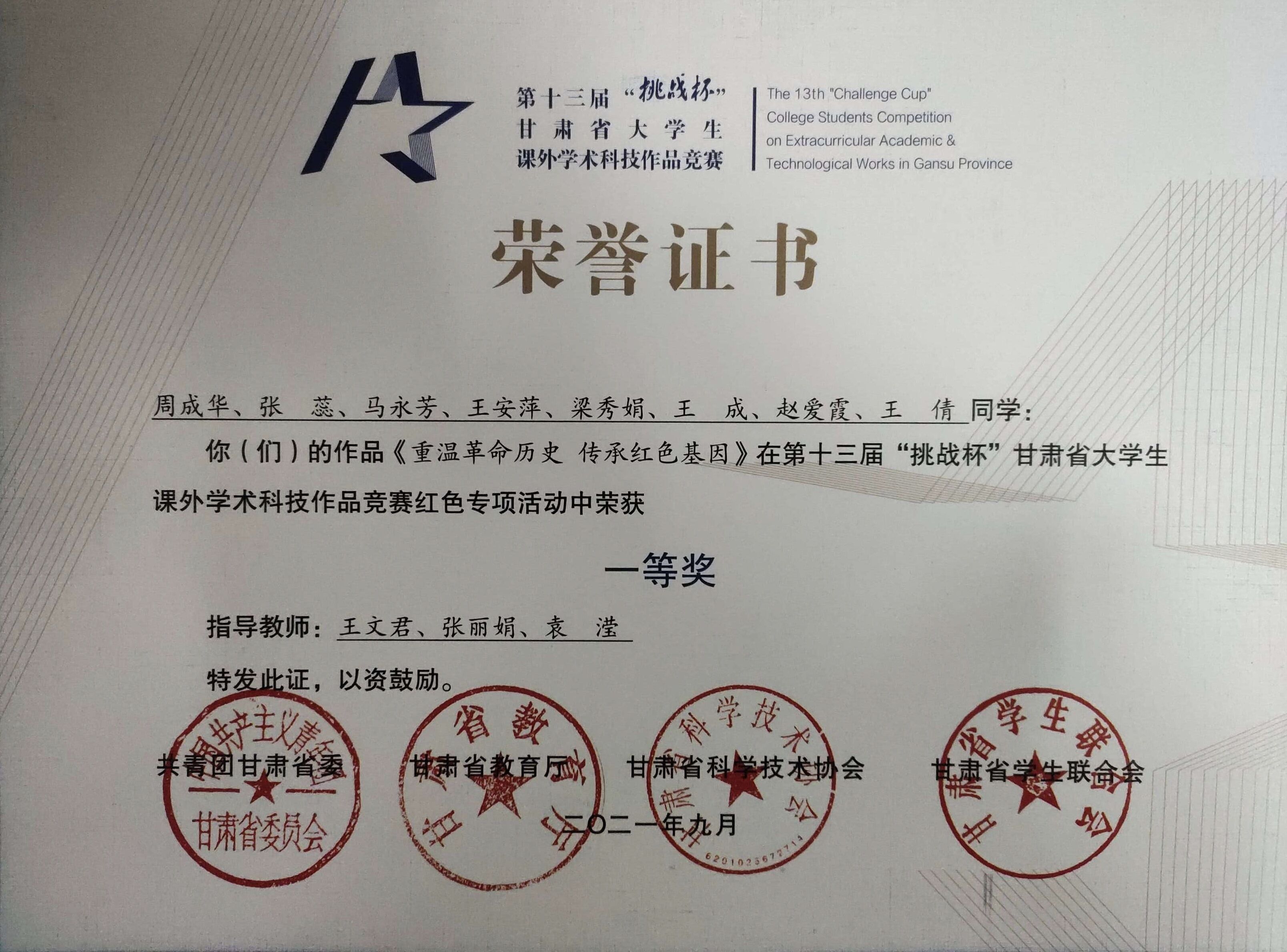 近日,第十三届“挑战杯”甘肃省老员工课外学术科技作品竞赛和红色专项活动竞赛结果公布,共有751个课外学术科技作品和139个红色专项作品拟获奖。威廉体育有4个作品获奖,其中《发扬长征精神 传承红色基因》作品获红色专项特等奖,《重温革命历史 传承红色基因》作品获红色专项一等奖,《甘肃宕昌哈达铺红色文化》作品获红色专项三等奖,《脱贫攻坚背景下陇南农民群体乡村振兴战略认同状况调查报告》获三等奖。此外,《发扬长征精神 传承红色基因》还获得第十七届“挑战杯”全国老员工课外学术科技作品竞赛红色专项三等奖。