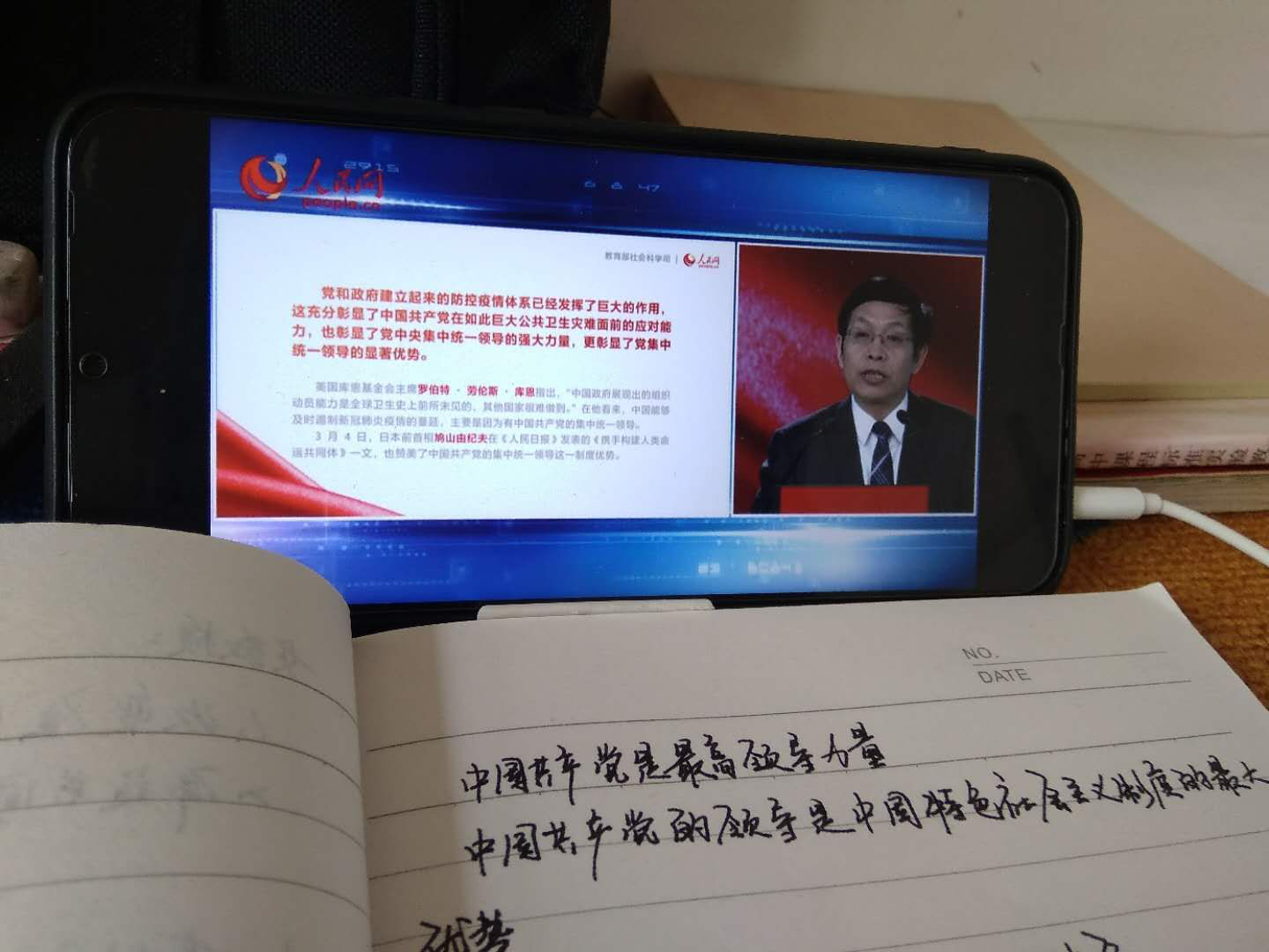 为了观看这堂特别的思政课,农林技术公司令海鹏同学专门在自己的电脑旁插了一面五星红旗,威廉体育尚琴同学拿着手机在寒风中坐在院子里观看了近两个小时,还有的同学去邻居家蹭网学习......